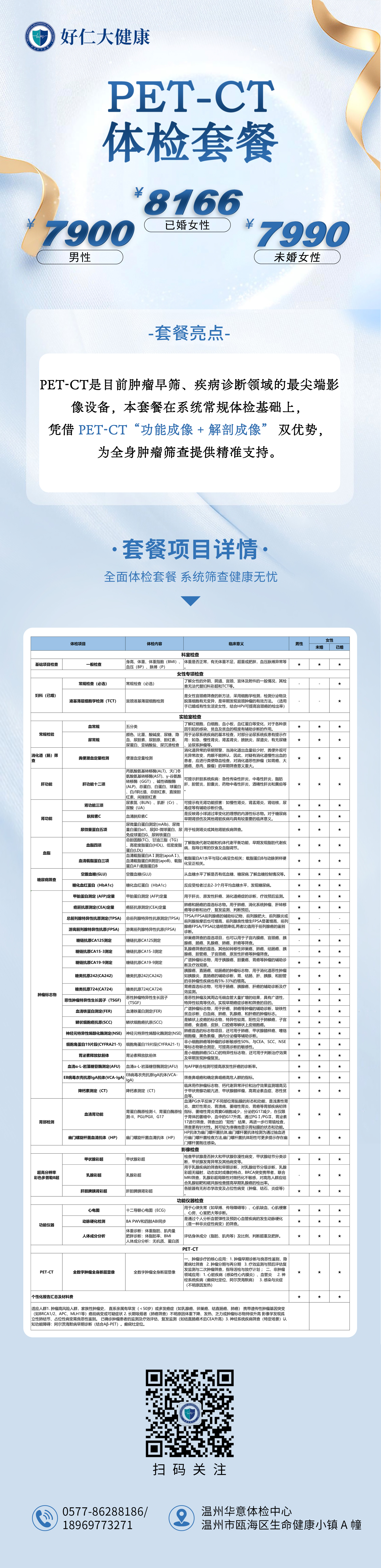 PET-CT是目前肿瘤早筛、疾病诊断领域的最尖端影像设备,本套餐在系统常规体检基础上,凭借 PET-CT“功能成像 + 解剖成像” 双优势,为全身肿瘤筛查提供精准支持。