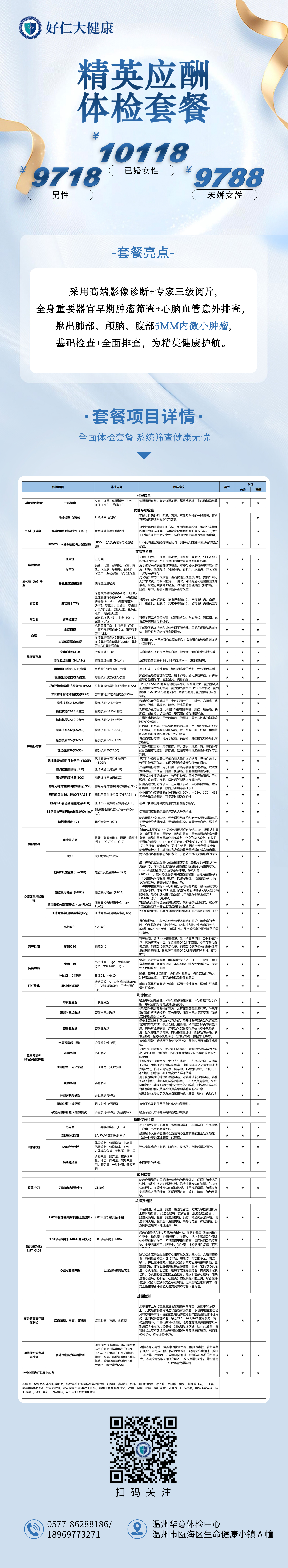 采用高端影像诊断+专家三级阅片。全身重要器官早期肿瘤筛查+心脑血管意外排查,揪出肺部、颅脑、腹部5mm内微小肿瘤;基础检查+全面排查,为精英健康护航。